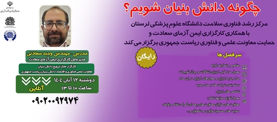 معاونت تحقیقات و فناوری، مرکز رشد فناوری سلامت دانشگاه علوم پزشکی لرستان با همکاری کارگزاری ایمن آزمای سعادت و با حمایت معاونت علمی، فناوری و اقتصاد دانش بنیان ریاست جمهوری برگزار میکند: * دوره آموزشی رایگان چگونه دانش بنیان شویم (آنلاین و رایگان)*
